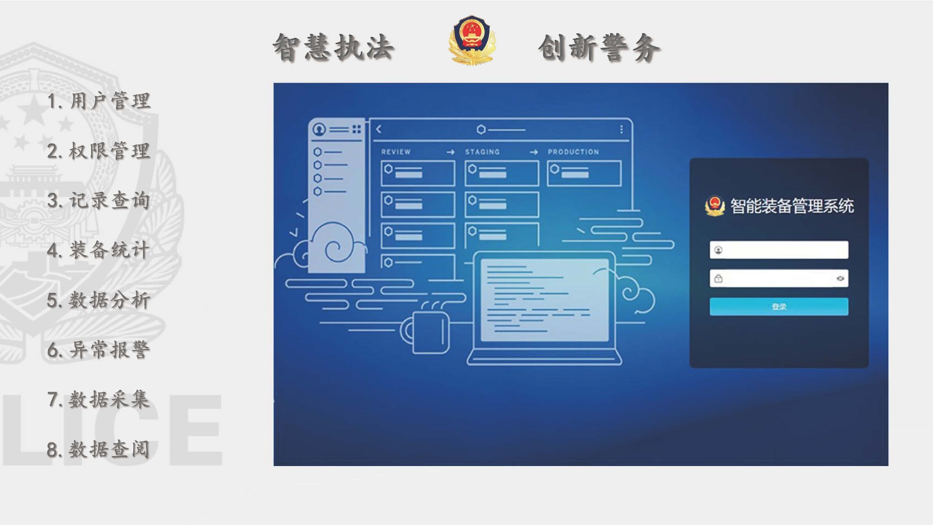 6、標識絲印:終端設備柜體明顯位置應具備“智慧執法”文字和圖標統一標識。