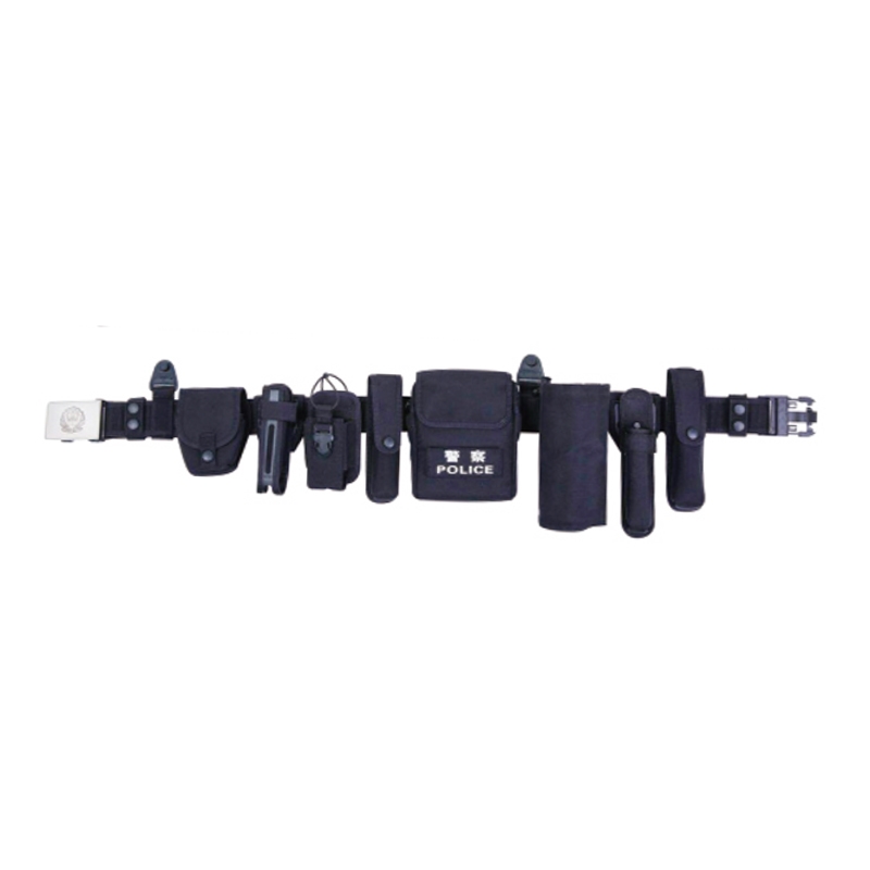 3、警用多功能腰帶由外腰帶、內腰帶、斜掛帶、快拔型警棍套、強光手電套、警用工作包、手銬套、催淚噴射器套、對講機套構成;